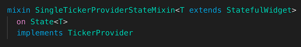 that implements the general TickerProvider interface. Animations are only applicable to stateful widgets (as the position in the animation is considered state). The new mixin support allows us to express this by declaring that only classes that extend the Flutter State class can use the mixin: