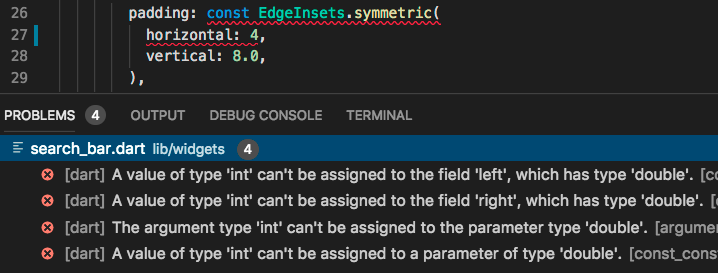 #New Flutter developers are often tripped up by analysis errors like these when specifying padding, setting font sizes, etc.: