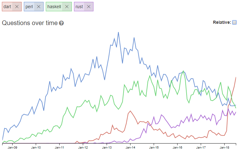 Over the last year, Dart has seen dramatic growth. Our own analytics suggest a ten-fold growth in external usage. In the last quarter, Dart was one of the fastest growing languages on GitHub, as measured by pull requests; the growth of StackOverflow questions also provides a vivid demonstration of Dart’s momentum: