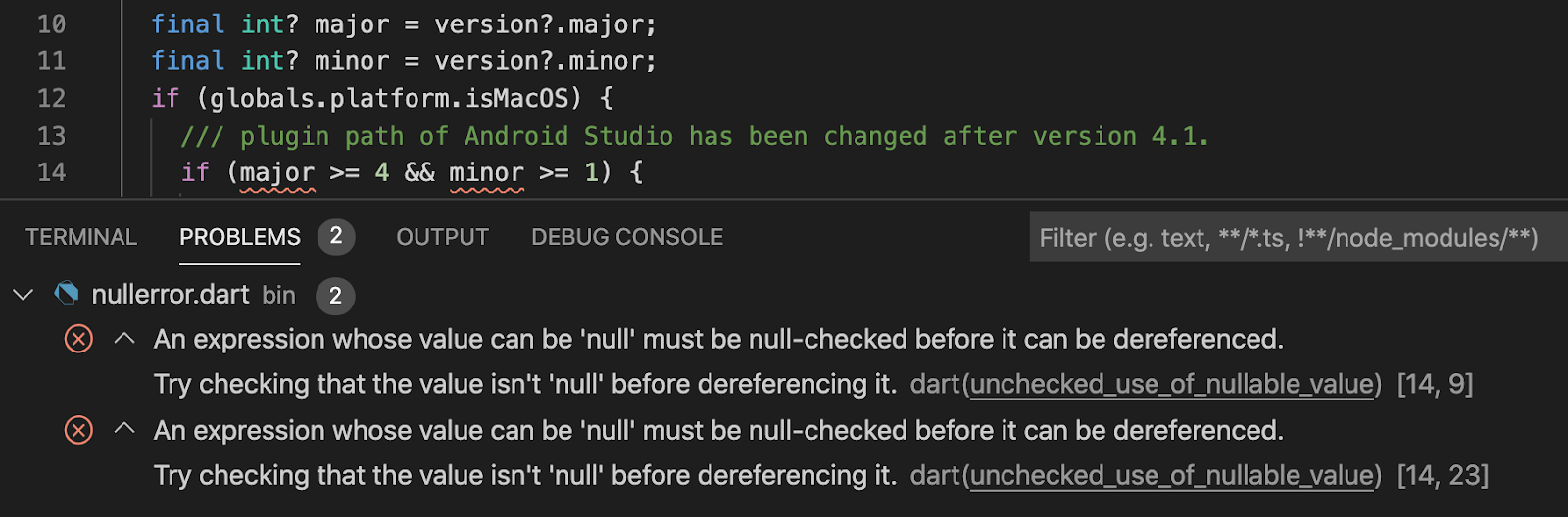 Can you spot the error? Because the version may be null, both major and minor may be null also. This bug may seem easy to spot here in isolation, but in practice code like this slips through all the time, even with a rigorous code review process like the one used in the Flutter repo. With null safety, static analysis catches this issue immediately: