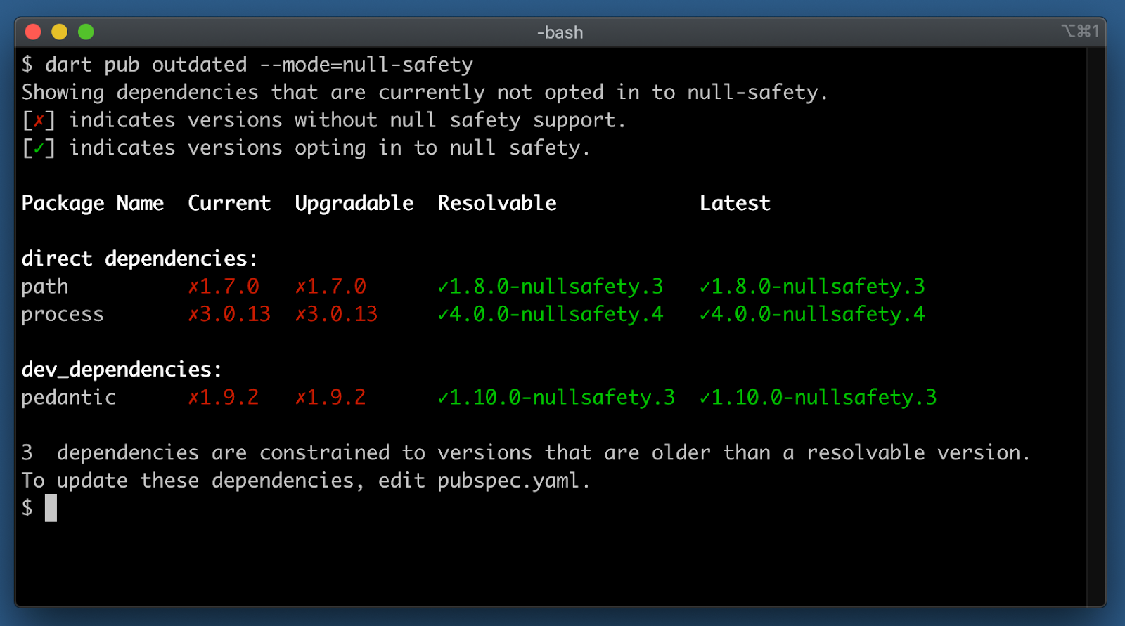 If null safety support is available in minor new versions, you’ll see those in the Upgradable column. Often null safety support will be available in major new versions; in that case you’ll see the versions listed under Resolvable in the outdated output. To upgrade to those, edit your pubspec.yaml file to allow those major versions. For example, you might change process: ^3.0.13 to process: ^4.0.0-nullsafety.
