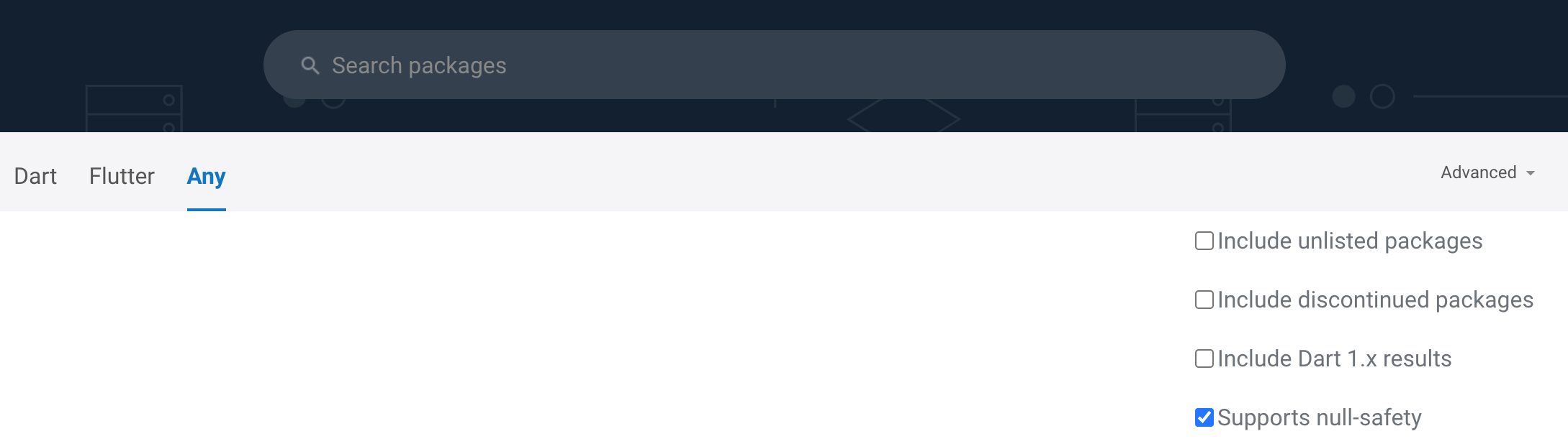 You can also find packages with null safety support on pub.dev using the new Null safety tags on package pages (for example collection 1.15) and a new Advanced search null safety search option.