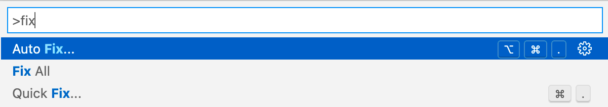 You can also invoke the Fix All command from the command palette, which you can open by selecting Command Palette… from the View menu, or by using the keyboard shortcut (F1 on any platform, Control+Shift+P on Windows and Linux, or Command+Shift+P on macOS). You can filter the list by typing the name of the command. The command palette looks something like this: