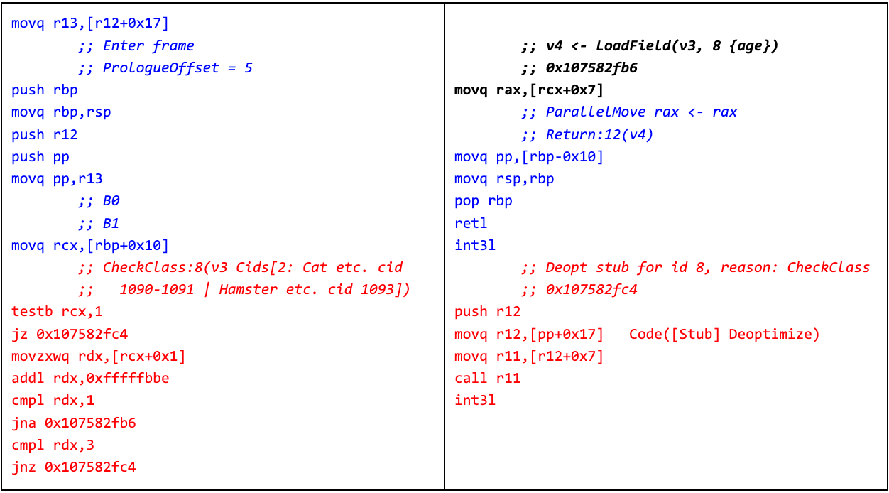 The code in blue is the prologue and epilogue for the method (to set up and restore the stack frame). The code in red checks for the expected cases — that the instance is non-null and is of one of the previously seen types — and invokes a slow path for other cases. The code in bold is the actual work to load the field.