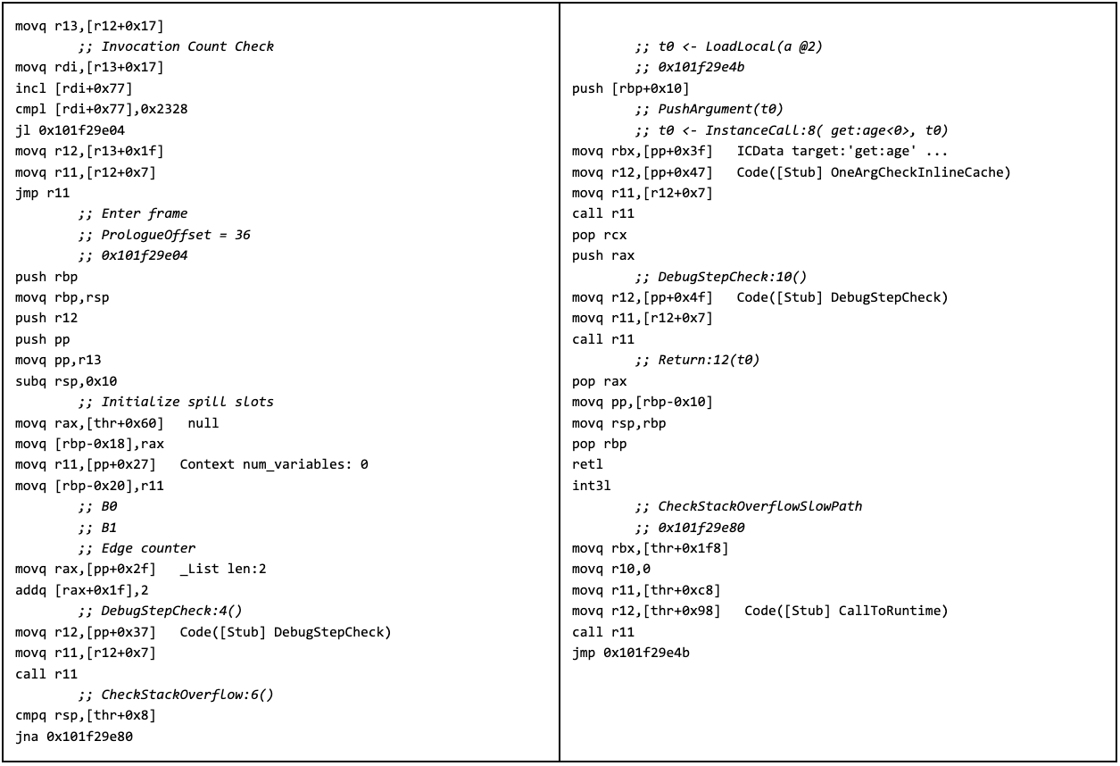 #In this case, the code is called repeatedly and triggers a second, optimizing compilation that generates the following 26 instructions: