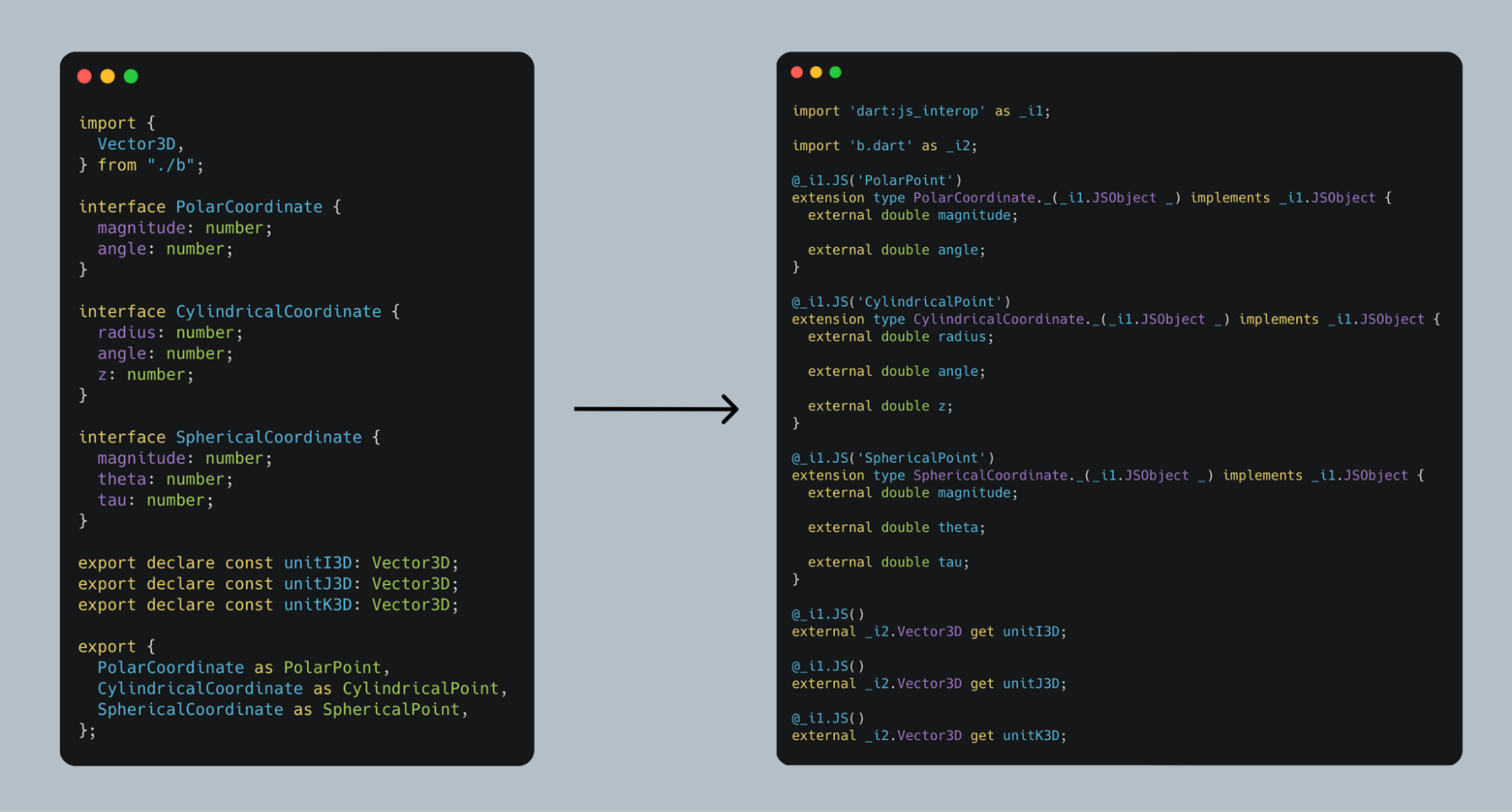 The generator works by parsing a .d.ts file and transforming its TypeScript declarations into their Dart equivalents. The declarations are generated based on how Dart interops with JS, ensuring correctness in terms of interop implementation with the JS code represented by the TS declaration code, as well as closeness to the TS declaration’s representation of the code, where possible.