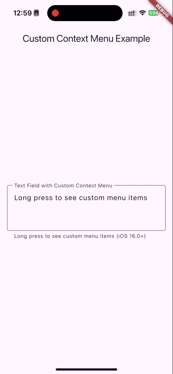 This project created the new IOSSystemContextMenuItemCustom API, allowing developers to easily add custom actions to the native iOS menu through TextField’s contextMenuBuilder property; developers can add menu items with custom titles and callbacks. The implementation bridges Flutter with the native iOS UIMenu system, ensuring custom items integrate seamlessly with standard iOS menu options (copy, paste) while maintaining the native look and feel.