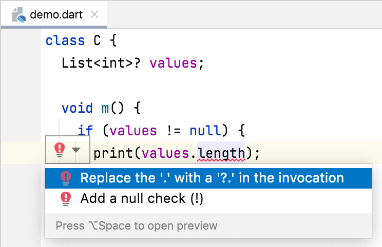 The correction message suggests two ways of resolving the problem: “Try making the access conditional (using ‘?.’) or adding a null check to the target (‘!’).”