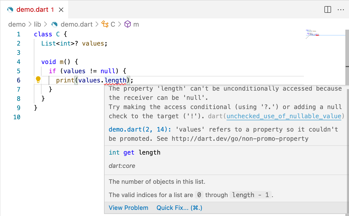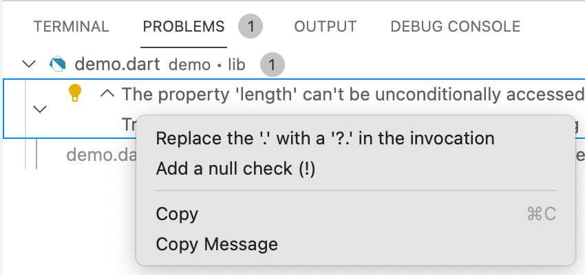 #Not every problem can be fixed automatically, and there isn’t a quick fix for every problem that could have one. Nevertheless, it’s definitely worth checking to see whether there’s an available quick fix the next time you have a diagnostic to fix. And if you don’t see a fix for a diagnostic that ought to have one, please let us know by creating a dart-lang/sdk issue.